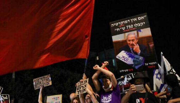 ويطالب المتظاهرون باستقالة نتنياهو بسبب لائحة الاتهام المقدمة ضده إلى المحكمة وتتضمن تهم الاحتيال والرشوة وإساءة الثقة.