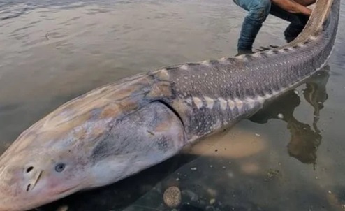 استخرج صياد كائنا ضخما طوله 6.8متر من عمق أحد الأنهار بينما كان يصطاد في زورقه الصغير مع صديقته.