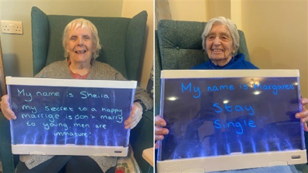 بمناسبة اليوم الأكثر رومانسية في العام، قدم سكان دور رعاية مسنين ببريطانيا نصائحهم الخاصة بشأن الزواج والارتباط عن طريق رفع لافتات تحمل آراء مبنية على خبرة عقود من العمر.