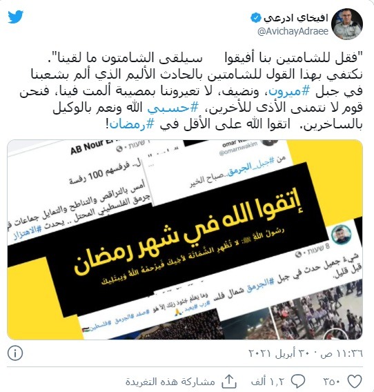 وقال أدرعي في تغريدة نشرها اليوم الجمعة عبر “تويتر”: “فقل للشامتين بنا أفيقوا سيلقى الشامتون ما لقينا. نكتفي بهذا القول للشامتين بالحادث الأليم الذي ألم بشعبنا في جبل ميرون”.