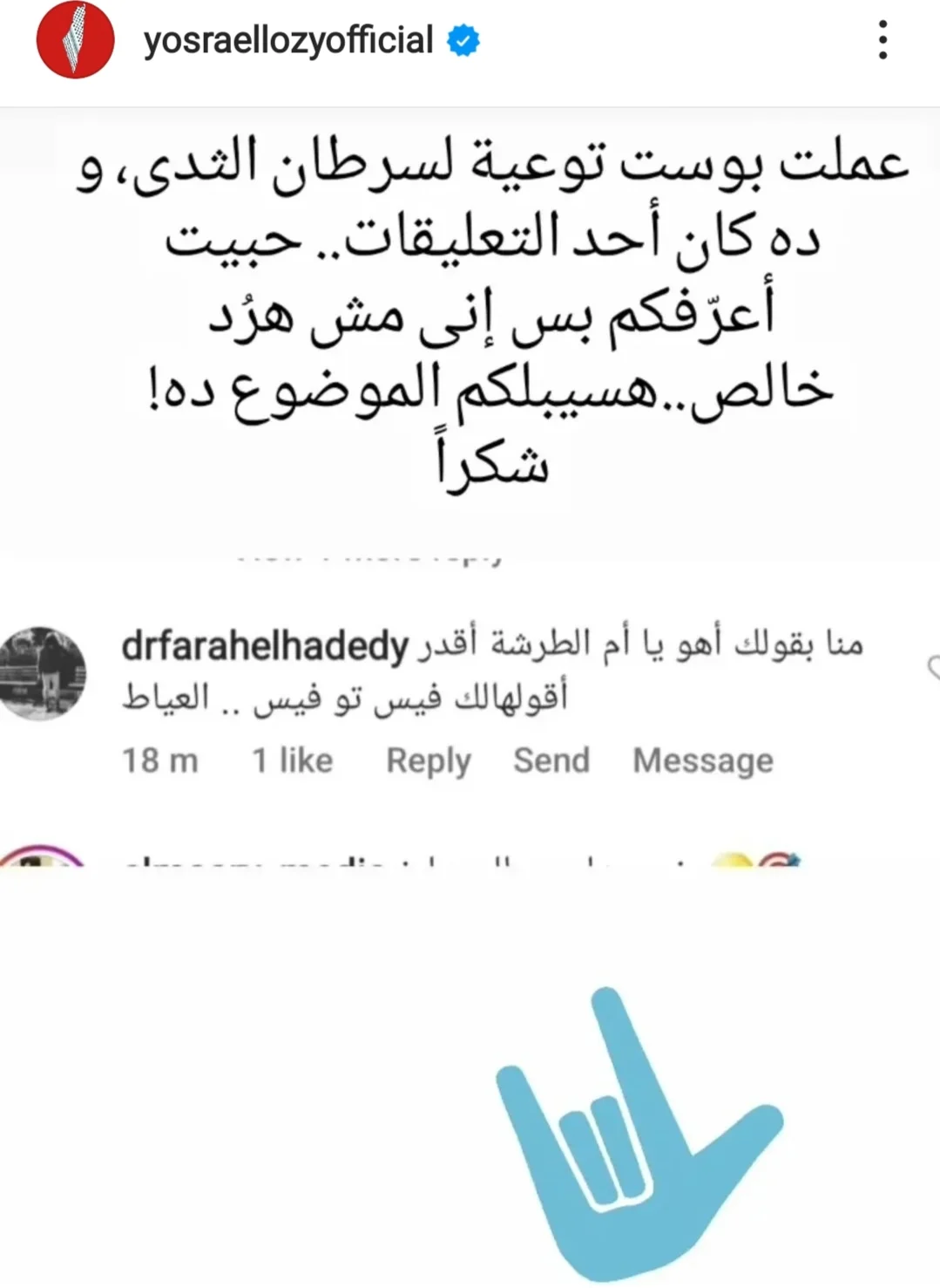 وعلقت: «عملت بوست توعية لسرطان الثدي، وده كان أحد التعليقات.. حبيت أعرفكم بس إني مش هرد خالص.. هسيبلكم الموضوع ده! شكرًا».