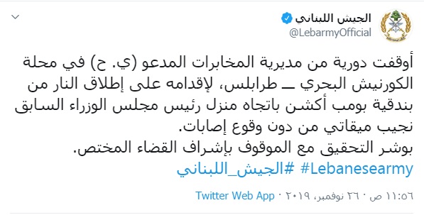 وذكر بيان للجيش اللبناني على تويتر أن دورية من مديرية المخابرات أوقفت المدعو (ي. ح) في محلة الكورنيش البحري بطرابلس، لإقدامه على إطلاق النار من بندقية “بومب أكشن” باتجاه منزل رئيس مجلس الوزراء السابق ميقاتي من دون وقوع إصابات، وبوشر التحقيق مع الموقوف بإشراف القضاء المختص.