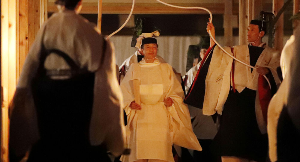 ووسط أضواء المشاعل المتمايلة وترانيم الرهبان، خرج الإمبراطور ناروهيتو من وراء ستائر المزار المقدس البيضاء حوالي الساعة الثالثة صباحا، لتتم مراسم حضرها رئيس الوزراء شينزو آبي وحوالي 400 شخصية بارزة في مقصورة مفتوحة.