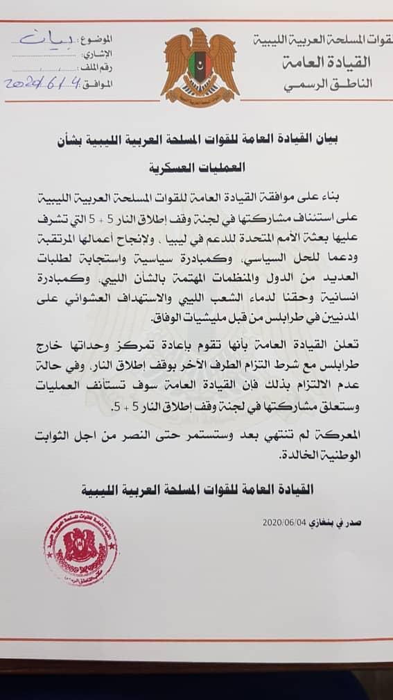 وحذرت القيادة العامة على لسان الناطق باسمها اللواء أحمد المسماري، من أنها “ستستأنف العمليات وستعلق مشاركتها في لجنة وقف إطلاق النار (5 + 5)، في حال لم يلتزم الطرف الآخر بالهدنة المعلنة”.