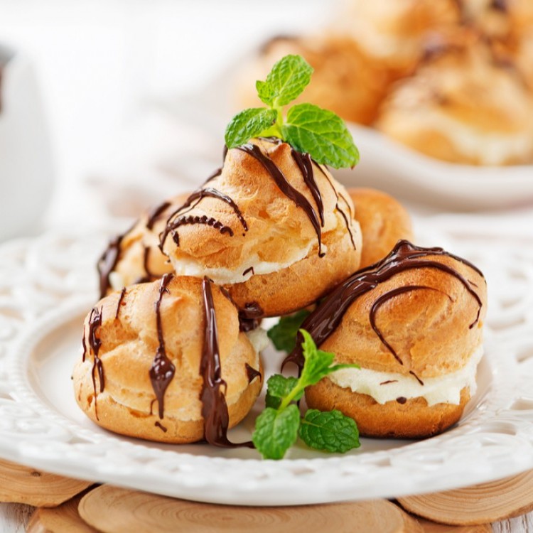 وزعي صوص الشوكولاتة فوق عجينة البف المحشوة وقدميها.