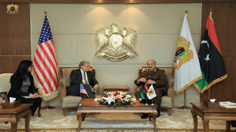بدوره، أفاد المكتب الإعلامي “للجيش الوطني الليبي” بأن اللقاء الذي جمع حفتر والسفير الأمريكي بحث “ملف الأزمة الليبية المطروح على الساحة الدولية، ودور الجيش الوطني في محاربة الإرهاب وتأمين البلاد وحفظ سيادتها.