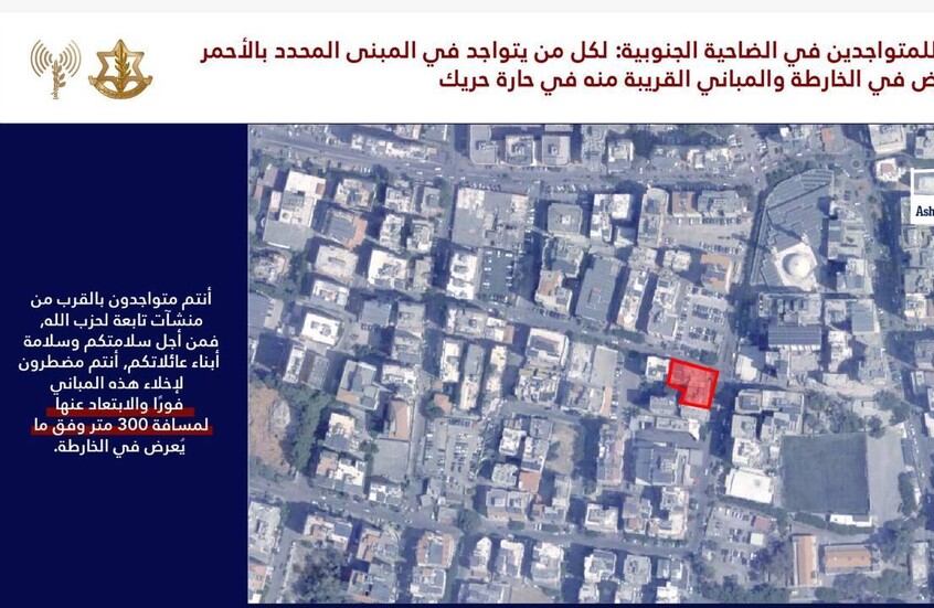 وفي وقت سابق اليوم الأربعاء،  وجه الجيش الإسرائيلي إنذارا عاجلا إلى المتواجدين في الضاحية الجنوبية في بيروت وخاصة في حي حارة حريك، داعيا “كل من يتواجد في المبنى المحدد بالأحمر وفق ما يعرض في الخارطة والمباني المجاورة له إلى الإخلاء فورا والابتعاد عنها لمسافة لا تقل عن 300″.