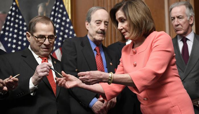 والتقطت بيلوسي قلما تلو الآخر من عشرات الأقلام المتراصة بجانبها على أطباق فضية، واستخدمتها للتوقيع بحروف اسمها على القرار الاتهامي بحق الرئيس دونالد ترامب، ليحال بعدها القرار إلى مجلس الشيوخ الذي سيتولّى محاكمته.