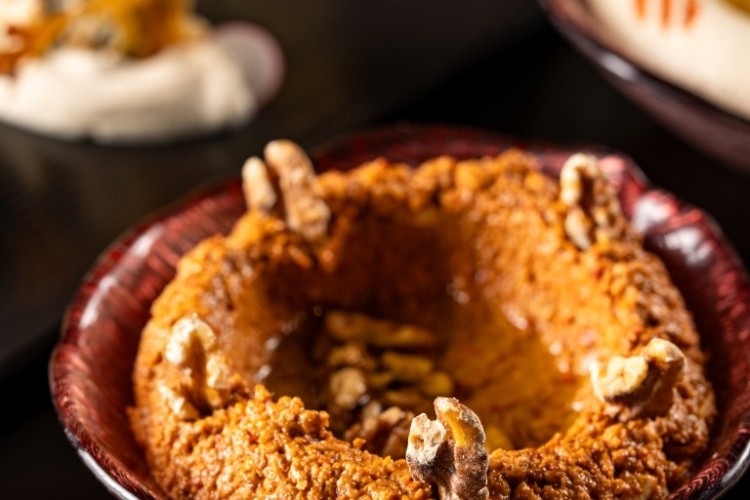 تنزع القشرة عن الفليفلة المشوية وتطحن مع البصل ونصف كمية الجوز، ويضاف البقسماط ونصف كوب الزيت مع الطحينة ودبس الرمان والملح.