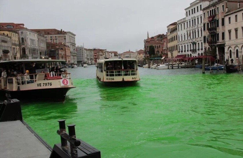 في 22 نوفمبر، قام نشطاء المناخ بسكب مادة صبغية خضراء زاهية آمنة في مياه القناة الكبرى – الشريان المائي الرئيسي في البندقية – تحت شعار “أوقفوا الإبادة البيئية”. وجاء هذا الاحتجاج تزامنا مع انعقاد مؤتمر الأمم المتحدة للمناخ COP30 في البرازيل.