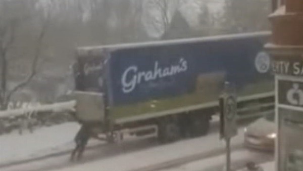 خلال العاصفة دارسي، ظهرت المرأة وتدعى «شارلين ليزلي» 33 عامًا، في مقطع فيديو وهي تدفع شاحنة حليب جراهام العملاقة في شارع مغطى بالثلوج في كاودنبيث بـ فايف.