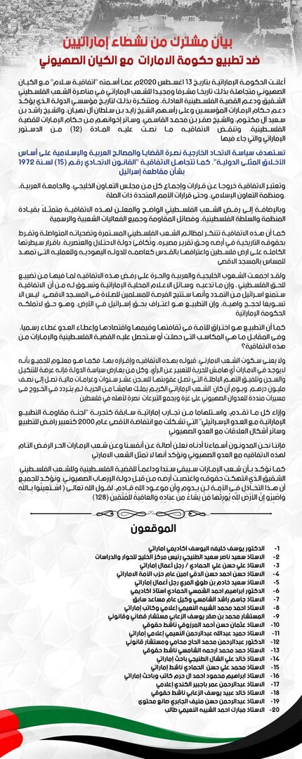 أصدر نشطاء إماراتيون بيانا مشتركا ضد التطبيع الإماراتي مع إسرائيل.