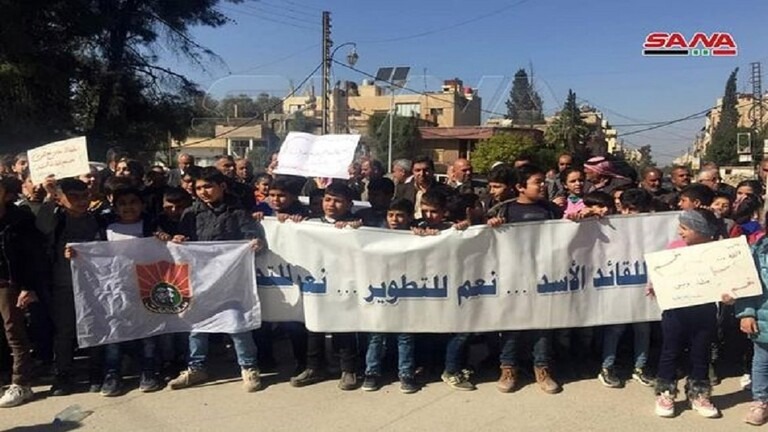 إضافة إلى لافتات تحمل عبارات “الله . سوريا .. بشار وبس” و”نعم للقائد الأسد .. نعم للتطوير .. نعم للتحرير”.