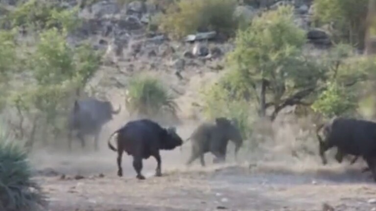 جواميس تنقذ فيلا صغيرا من قطيع أسود