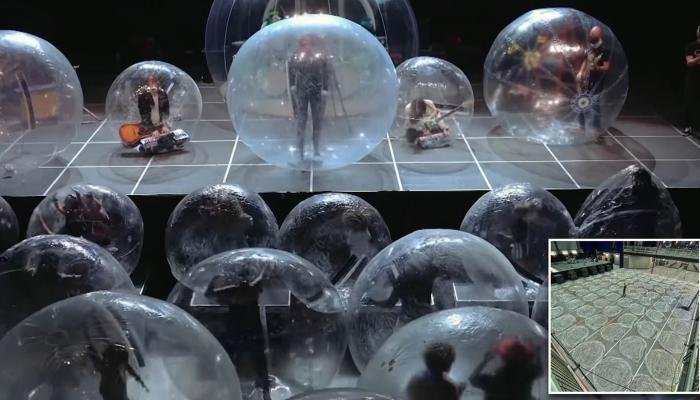 وتظهر لقطات من العرض، الذي أحيته فرقة “فليمينج ليبس” (The Flaming Lips)، بعض الأشخاص داخل 100 كرة قابلة للنفخ.