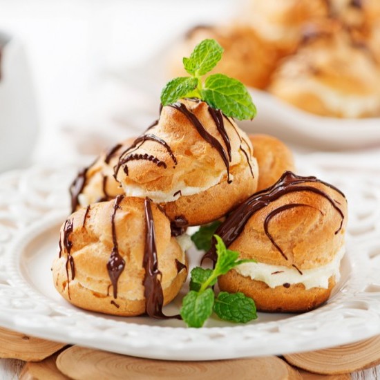 - وزعي صوص الشوكولاتة فوق عجينة البف المحشوة وقدميها.
