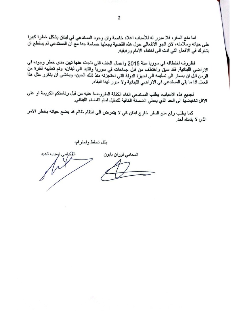 كما طلبت جهة الدفاع إلغاء قرار منع السفر خارج لبنان.