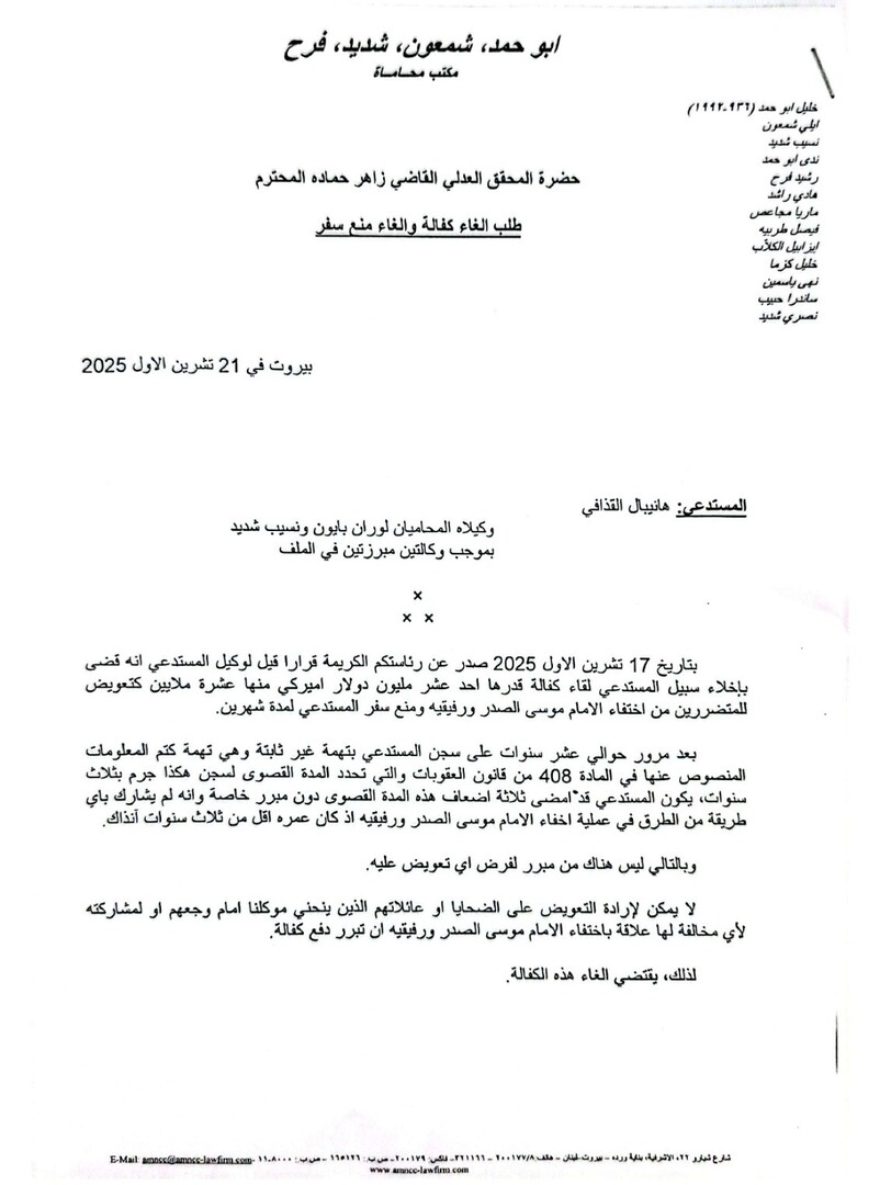 وقدم دفاع هانيبال القذافي بهذا الطلب أمام المحقق العدلي في قضية تغييب الصدر، وبحسب المعلومات، فإن “هذه الخطوة اتت اعتراضا على ما يعتبره فريق الدفاع إقرارا ضمنيا بأن موكلهم كتم معلومات تتعلق بقضية الإمام موسى الصدر، وهو ما ينفيه القذافي الابن بشكل قاطع”.