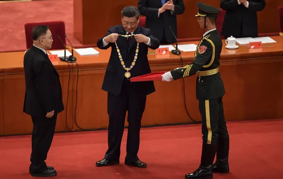باهتمام، وأمام مئات المسؤولين في الحزب والكوادر والعاملين في مجال الصحة، وضع شي ميداليةً ذهبية ثقيلة فوق رأس كبير علماء الأوبئة، تشونج نانشان.
