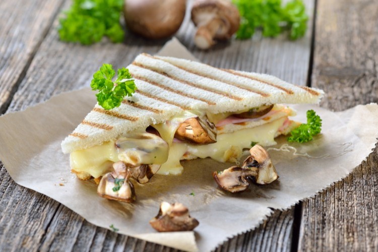 - ضعي كمية من الفطر والبصل على 2 من قطع التوست ثم أغلقي الساندويش بقطعة أخرى من التوست.