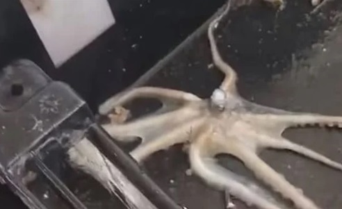 وتظهر التسجيلات القرش وهو مصاب بشدة حتى تأثرت حركته، في حين أن رأس الأخطبوط قد تمزق بشكل قاسٍ وألقي به في البحر قبل أن يُلقى على الأرض، حيث لا تزال مخالبه الثمانية تتلوى.