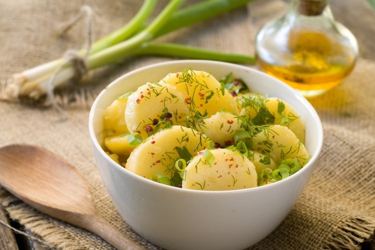 5. اسكبي سلطة البطاطس في طبق التقديم، أدخليها إلى الثلاجة لحوالي ساعة ثم قدميها.