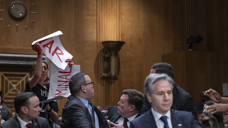 قاطع متظاهرون غاضبون من سياسة البيت الأبيض فيما يتعلق بقطاع غزة وزير الخارجية الأمريكي أنتوني بلينكن خلال جلسة استماع أمام لجنة العلاقات الخارجية بمجلس الشيوخ 4 مرات متتالية.