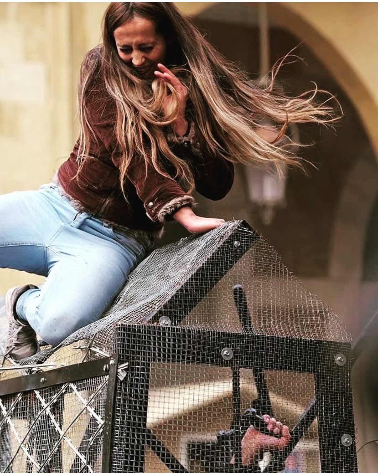 وصعد بعض المتظاهرين على الحاجز لمساعدتها بالنزول إلى الأرض.