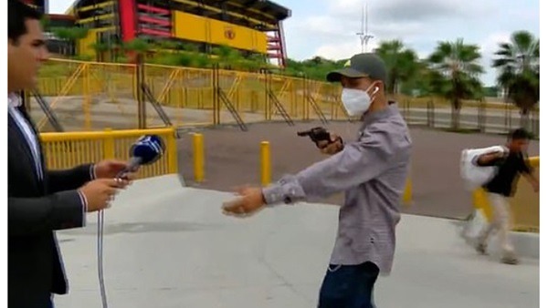 ووفقًا لما أوردته تقارير إخبارية، فإن المراسل الرياضي “دييجو اوردينولا”، وهو من دولة الإكوادور في أمريكا الجنوبية، كان في بث مباشر من أمام ملعب لكرة القدم بمدينة “جواياكيول”، والتي توصف بكونها أكبر مدن الإكوادور وأكثرها ازدحامًا بالسكان، وفجأة دون سابق إنذار اقترب منه رجل يحمل مسدسًا ووجهه ناحيته وشرع في تهديده.