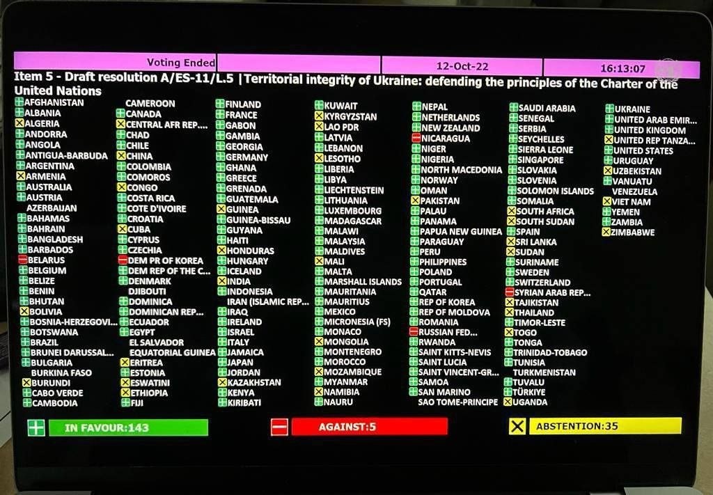 وصوتت روسيا وبيلاروس وكوريا الشمالية ونيكاراغوا وسوريا ضد القرار. ومن بين الممتنعين عن التصويت أتت الصين والهند وجنوب إفريقيا وأرمينيا وكازاخستان وقيرغيزستان وطاجيكستان وأوزبكستان والسودان والجزائر.