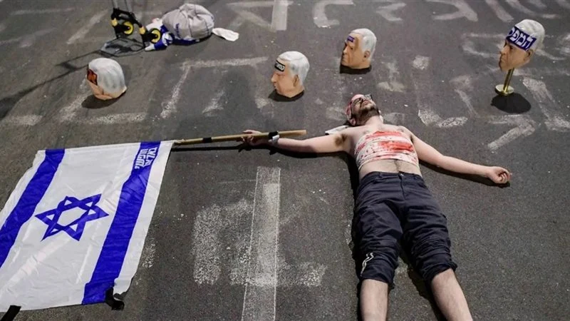 علق رئيس وزراء الاحتلال الإسرائيلي بنيامين نتنياهو على عرض رؤوس مقطوعة مزيفة تحمل وجهه، حول متظاهر يرتدي ضمادات مزيفة ملطخة باللون الأحمر، أثناء مظاهرة مناهضة للحكومة في تل أبيب مساء السبت.