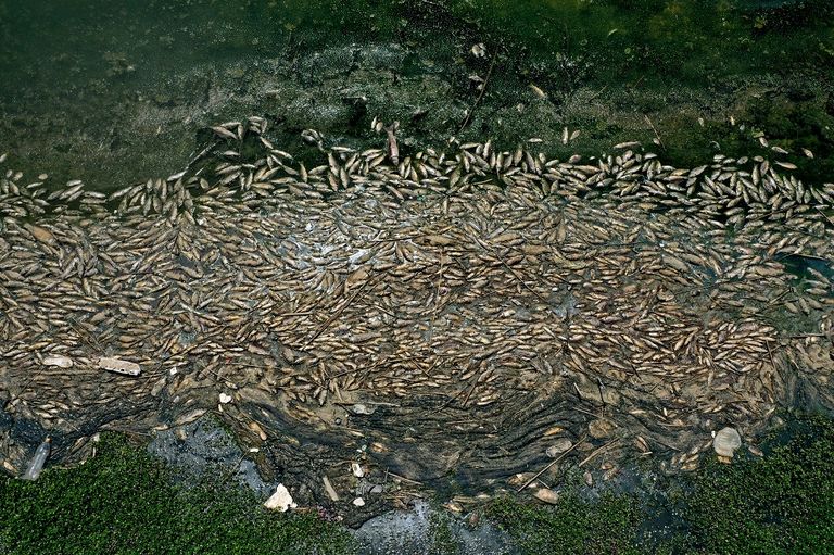 ويمكن رؤية مئات الأسماك من كل الأحجام مكدسة الخميس على مسافة تفوق 5 كيلومترات على ضفة البحيرة، فيما تنتشر رائحة نتنة في الجو.