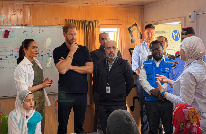 وصل الأمير هاري وميغان ماركل أمس الأربعاء إلى الأردن حيث التقيا لاجئين سوريين في مخيم الزعتري وأطفالا فلسطينيين تم إجلاؤهم من قطاع غزة.