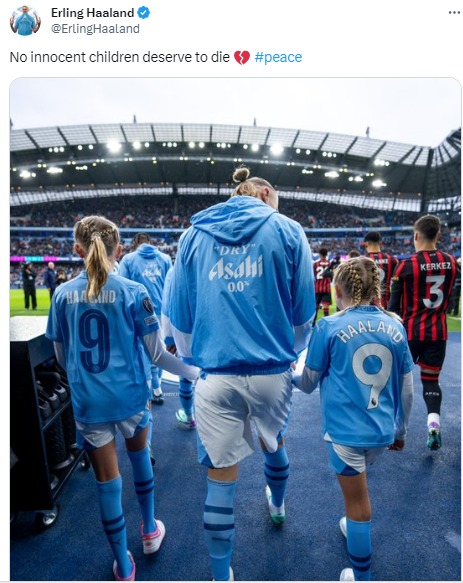وكتب هالاند، عبر حسابه، قائلا:”لا يوجد أطفال أبرياء يستحقون الموت”.