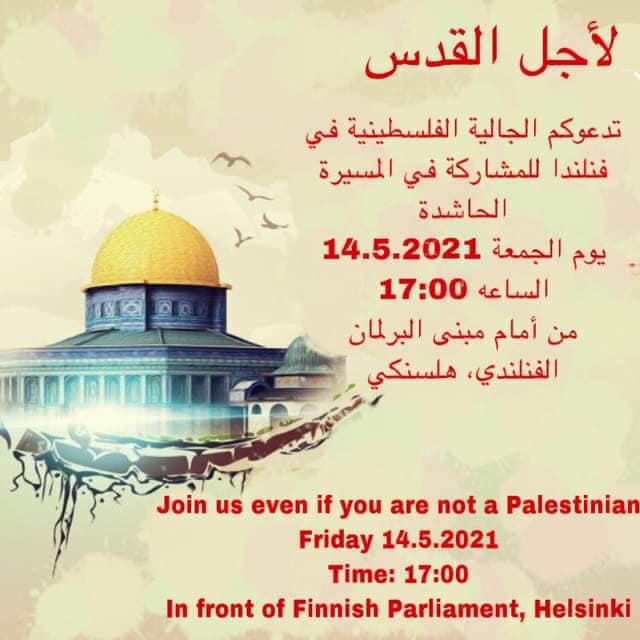 دعت الجالية الفلسطينية في فنلندا جميع أبناء الشعب الفلسطيني والعربي والإسلامي وأحرار العالم، للمشاركة في المسيرة الحاشدة والتي تحمل اسم “مسيرة من أجل القدس”، وذلك في تمام الساعة الخامسة من مساء يوم الجمعة المقبل الموافق 14 مايو الجاري، أمام مبنى البرلمان الفنلندي بهلسنكي، تضامنا مع الشعب الفلسطيني الذي يتعرض لعدوان غير إنساني من قبل قوات الاحتلال الإسرائيلي في حي الشيخ جراح وفي الأقصى المبارك وقطاع غزة.