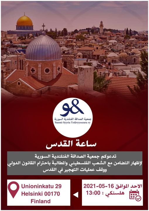 كما تنظم جمعية الصداقة الفنلندية السورية يوم الأحد المقبل الموافق 16 مايو الجاري، وقفة تضامنية مع الشعب الفلسطيني تحت عنوان “ساعة القدس” عند تمام الساعة الواحدة ظهرا أمام كاتدرائية هلسنكي.